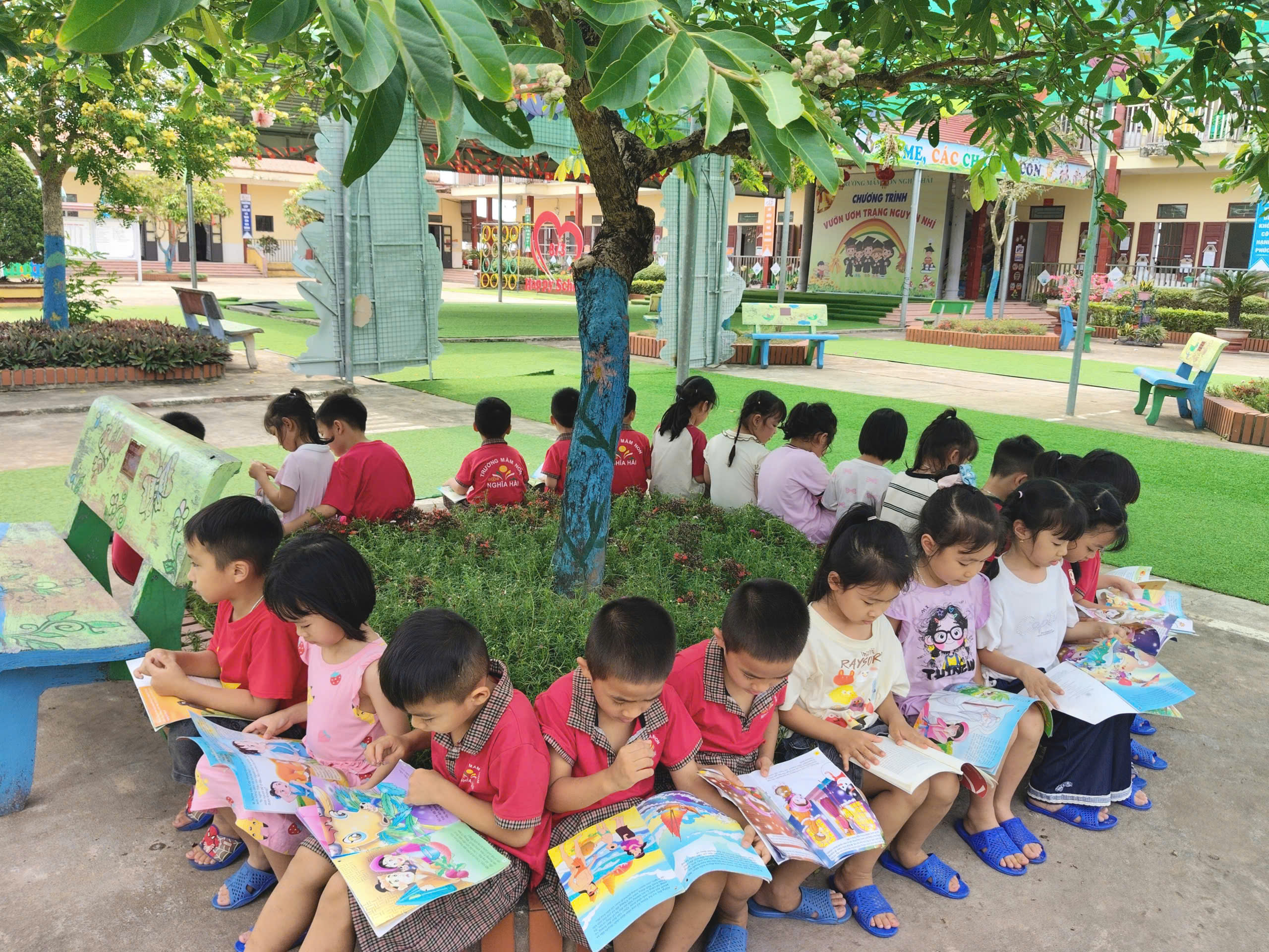 Trong Ngày hội đọc sách, các bé trường mầm non Nghĩa Hải sẽ được tham gia nhiều hoạt động thú vị như: nghe cô kể chuyện, xem sách tranh, đóng vai nhân vật trong truyện, trưng bày góc sách đẹp và giao lưu cùng bạn bè. Đây là cơ hội để trẻ thêm yêu sách và mạnh dạn thể hiện bản thân.