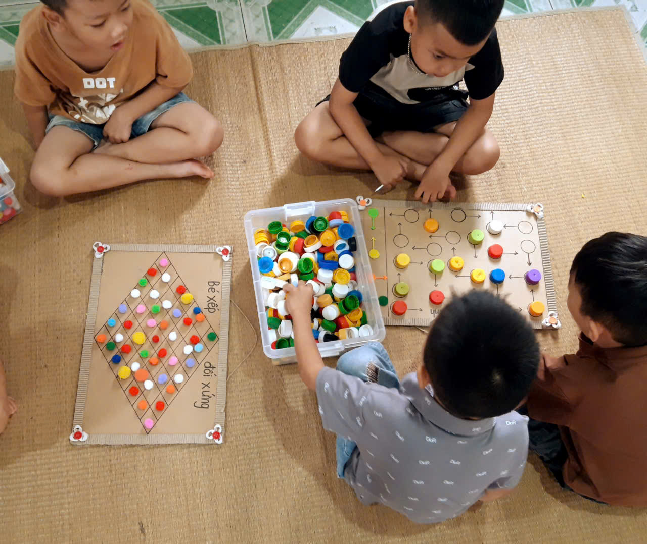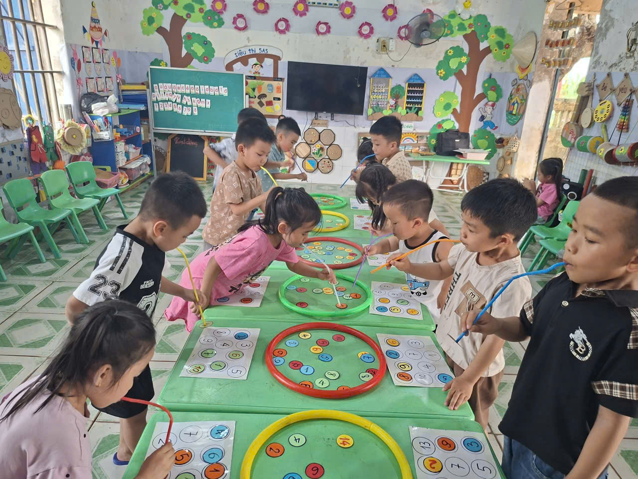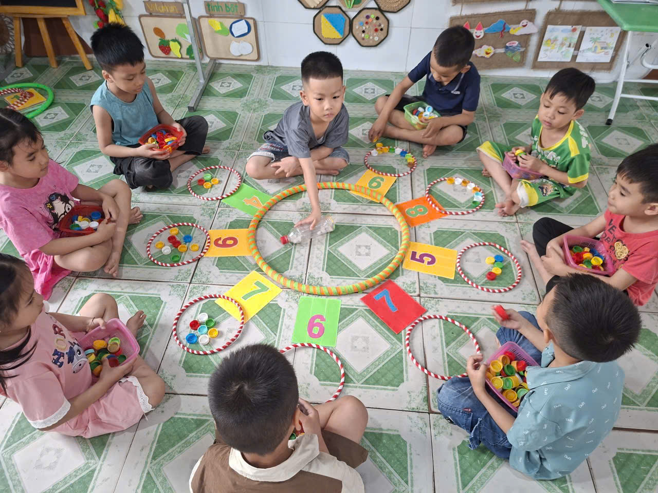 Thông qua các hoạt động như: Quay vòng quay tìm số, xúc xắc tìm số, Tìm số lượng tương ứng với số, viết số lên bảng, ống hút tìm số, … trẻ được ôn lại kiến thức về chữ số, đếm số lượng, so sánh và nhận biết mối quan hệ giữa số và lượng.